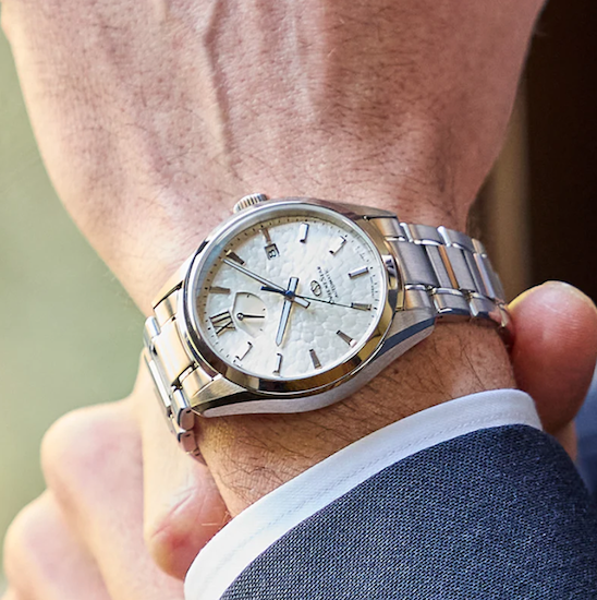 文字板は、時針、分針、秒針による中3針に加え、3時位置に日付、12時位置にオリエントスター特有のパワーリザーブの各表示を配したオーソドックスなデザインを採用する一方で、板面にはペルセウス座付近の流星群をイメージした手彫りの型模様が施されています。