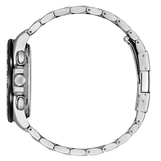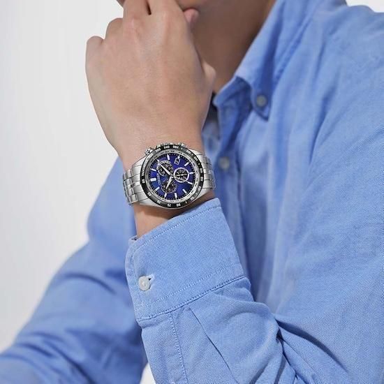 人気のエコ・ドライブ電波時計クロノグラフをアレンジして、深い海の中で静かに揺らめく水の表情を表現。ブラックのベゼルとディープブルーの文字板の間にホワイトの見返しリングをプラスし、立体感を演出しました。構造色の文字板の鮮やかさを際立たせながら、爽やかな印象も感じることができる1本です。