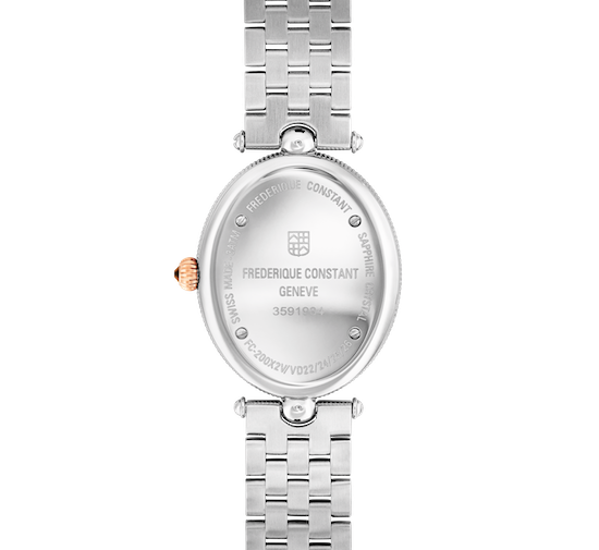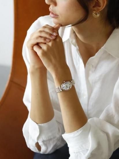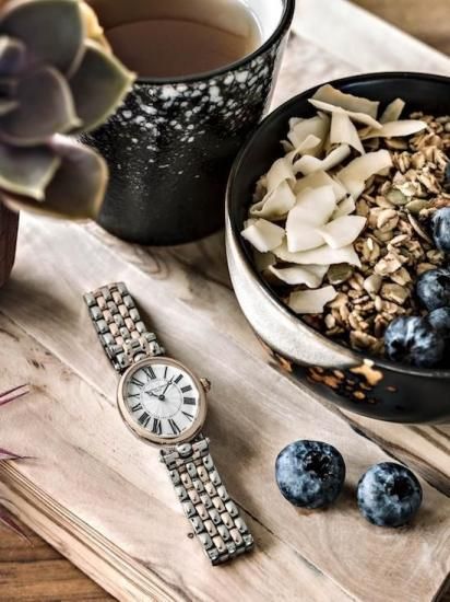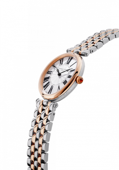 1940年代の豪勢な風潮からインスピレーションを得たクラシック アールデココレクション。オーバルのエレガントなケース側面はコインエッジ仕上げで美しい横顔です。連続的な波模様装飾の周囲にはマザーオブパールを配し、大きなローマン数字、ブレゲ針を配し、クラシックな気品が際立つ仕上がりです。