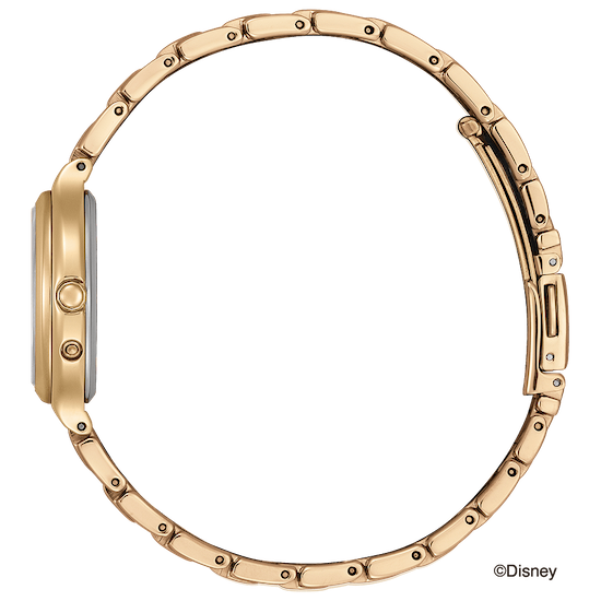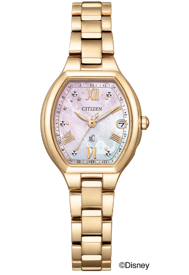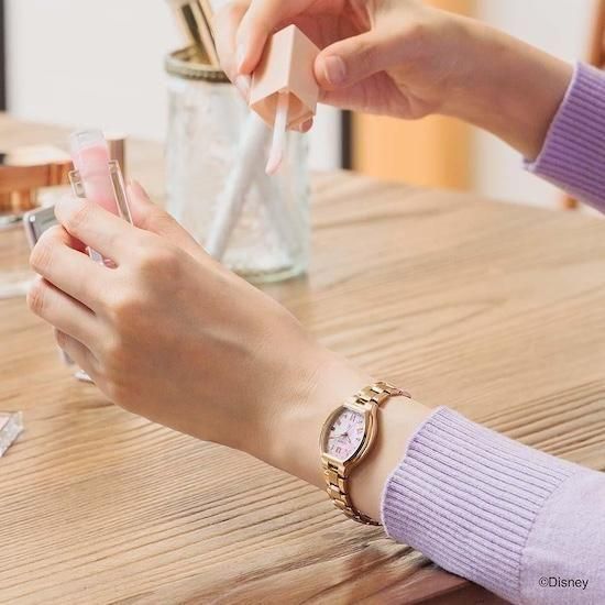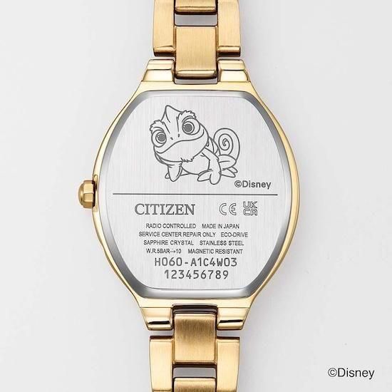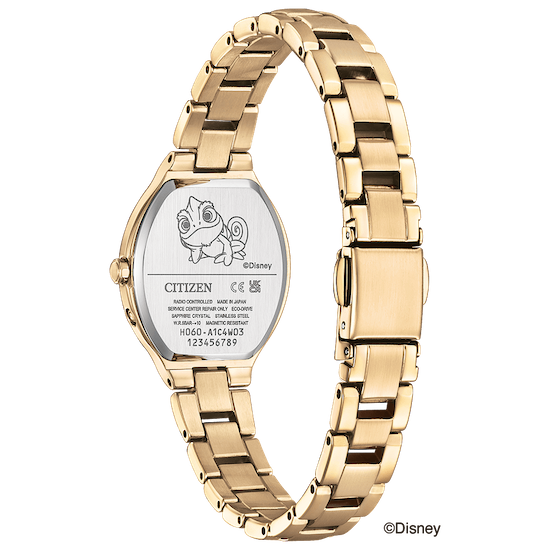 『塔の上のラプンツェル』の世界観を表現した限定モデル。白蝶貝文字板に淡いパープルのグラデーションを施し、エレガントなデザインのローマ数字インデックスとともに、きらめくカットパーツをレイアウト。夜空に浮かぶランタンの美しい輝きを、ゴールドやホワイトのパターンで表現しました。5時位置には、美しい情景を背景に、「ラプンツェル」と「ユージーン」がボートに乗って寄り添う姿を描きました。裏ぶたに「ラプンツェル」の親友「パスカル」を刻印した限定仕様です。