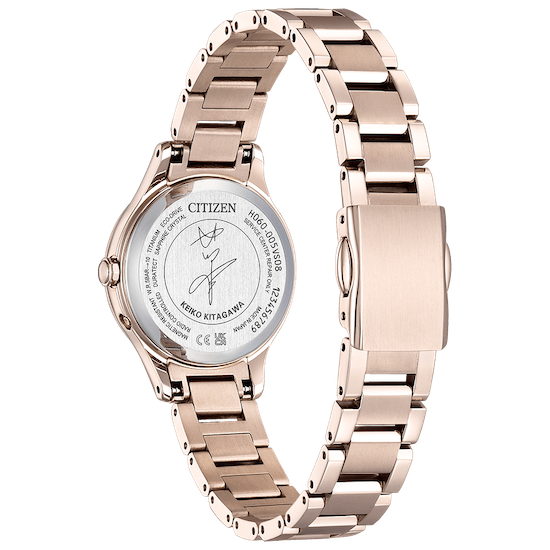 「安らぎ・平和・知恵」などの花言葉を持つ“オリーブ”をモチーフに、クリーンで艶やかな白蝶貝の文字板に、立体感のあるオリーブの葉と実をエッチングパターンで描きました。外周には、上品にきらめくラメを施しています。また、北川景子さんの誕生日(8月22日)にちなんで、8時と2時の位置に合計4ポイントのラボグロウン・ダイヤモンドをセッティング。さらに、22分の位置にはオリーブの花のモチーフをワンポイントとして添え、遊び心を感じさせるこだわりのデザインです。