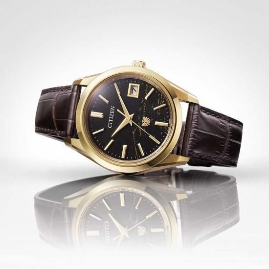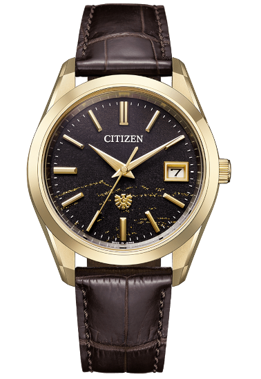 針やケース、インデックスのゴールドカラーがひときわ目を惹く黒文字板モデルは、「秋の夕暮れの情景」をモチーフに、夕陽の色合いのグラデーション印刷を施した上板と、金箔を用いた繊細な表現が印象的な黒和紙の組み合わせが特徴。ケースの落ち着いたゴールドカラーと相まって、山の端に夕陽が沈む秋の情景を表現したモデルです。
