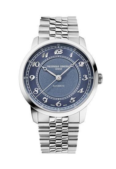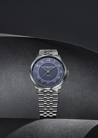 38.5 mm径サイズの自動巻きモデル「クラシック プレミア」。小ぶりなユニセックス仕様のクラウドブルーカラーのダイヤルに、半円形の5連ブレスレットを組み合わせました。中央から縁に向かい膨らむボンベダイヤルの中央は一段下げてグレイン、外周にはソレイユと凝った仕上げを施しました。クリスタルケースバックからは搭載したラ・ジュー・ペレ社のロングパワーリザーブムーブメントが覗きます。